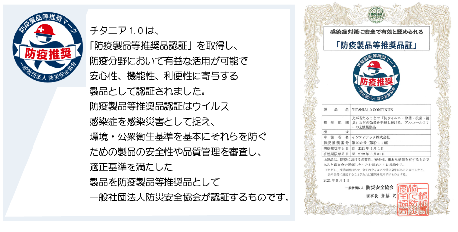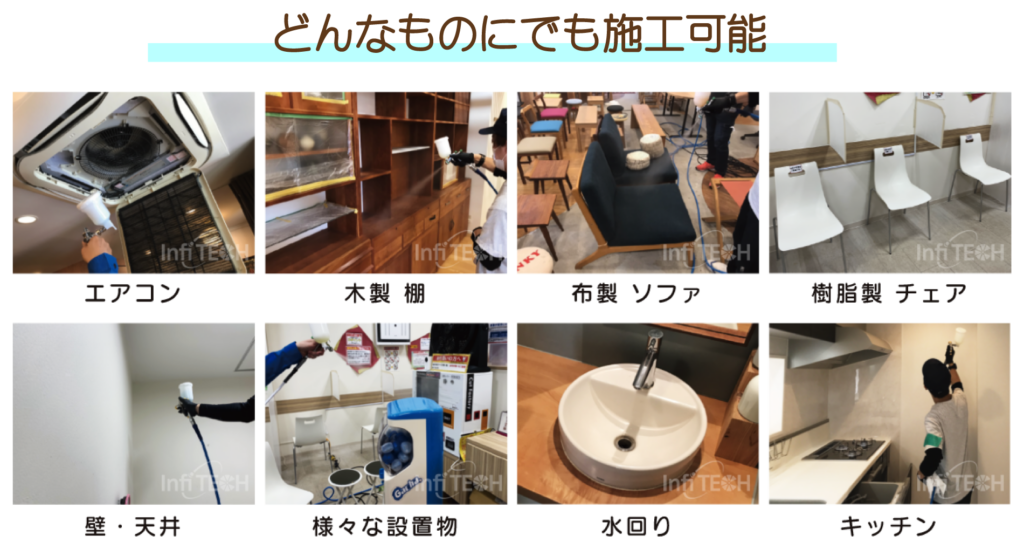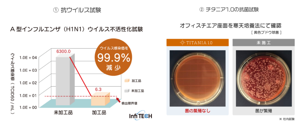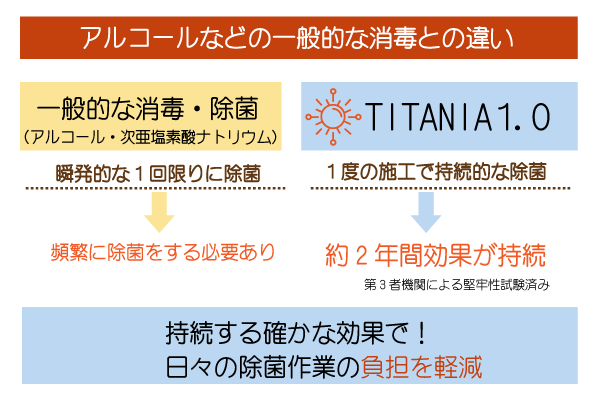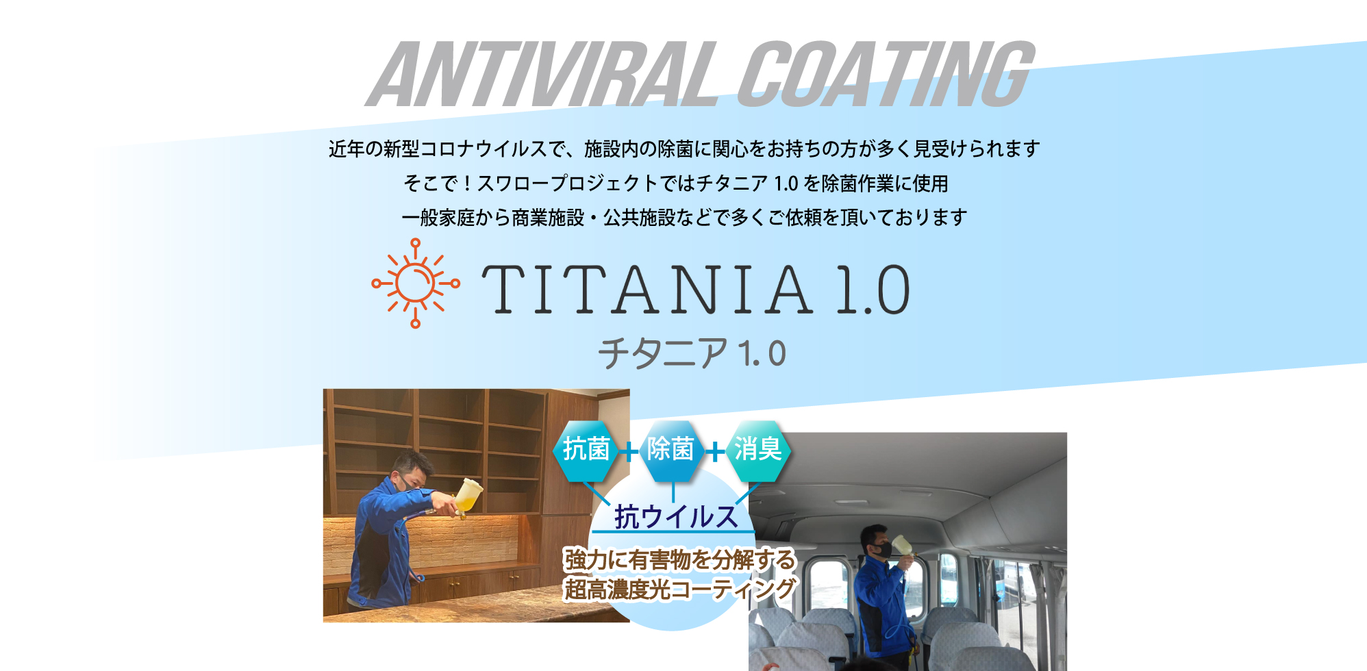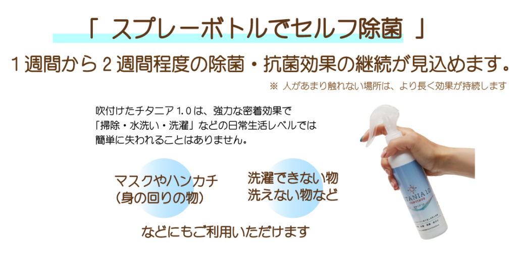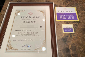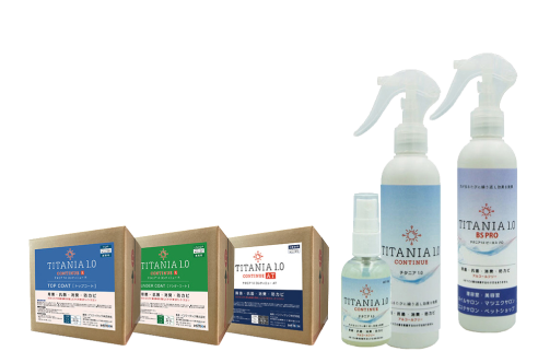 TITANIA1.0の「新型コロナウイルス」への 有効性が確認されました第三者機関の試験において、インフィテック株式会社が開発・製造する光触 媒製品「TITANIA1.0」による「新型コロナウイルス(SARS CoV-2)」の不活化を確認 しました。 日々の消毒・除菌を少しでも楽に、効果的に! 接触感染対策に効果大!チタニア1.0は「抗ウイルス・除菌・抗菌・消臭」などの効果を持つ光触媒製品です。チタニア1.0を吹き付けた面に付着した菌やウイルスは、光が当たることにより「継続して無力化」されます。 この「継続する効果」と「人体に無害な成分」であることが、一般的な消毒「アルコール・漂白剤(次亜塩素酸ナトリウム)」などとの大きな違いです。除菌を行うことが日常となった今、チタニア1.0を使用すれば日々の除菌作業の負担を減らし少しでも楽に、より効果的なウイルス・菌対策が可能です。また継続して除菌する効果は、様々な人が触れるドアノブや水道の蛇口などにとても効果的です。チタニア1.0はインフィテック株式会社が開発・製造する光触媒製品です。 チタニア1.0を吹付けた表面は、様々な有機物を強力に分解し「除菌・抗菌・防カビ・消臭」などの効果を発揮します。太陽光はもちろん、紫外線、蛍光、ED、ブラックライトでも反応し、チタニア1.0が残存する限り常に分解効果を発揮し続けます。チタニア1.0は、「アルコール・次亜塩素酸ナトリウム」などとは違い無害な成分で作られており、人体にも環境にもやさしい製品です。 「 プロによる業務用特殊施工 」 2年間の効果を保証する施工です 専門知識を持った専任の技術者により消毒作業と、より密着性の高い業務用チタニア1.0による2層コーティングを施します。部屋を丸ごとでも、テーブルや椅子のみなど部分的でも、幅広く対応可能です。※ 施工保証書を発行します ムラなく隅々まで、布類などには素材の奥まで、しっかりと効果を引き出す専門の技術者による施工 一般には扱いにくい限界レベルの高濃度。(スプレーボトルタイプの約3倍)より高密度にチタニア1.0の膜を形成し、隙間なく分解効果を発揮します 2層構造のコーティングにより高密知着を実現し、素材を痛めること無く長期間効果を持続させます。 菌や汚れを数値化し、施工後の効果を目に見える形でご確認いただけます 家具1つ1つから、店舗やイベントスペースなどの大型の施設も丸ごと施工可能 専門知識を持った専任の技術者により消毒作業と、より密着性の高い業務用チタニア1.0による2層コーティングを施します。部屋を丸ごとでも、テーブルや椅子のみなど部分的でも、幅広く対応可能です。※ 施工保証書を発行します ※ ガラス・プラスチックなどの無機物には密着しにくい場合があります※ 色の濃い物や撥水性の高い素材への使用は、白く跡が残る場合がありますので必ず適量を守り必要に応じて拭き上げてください
