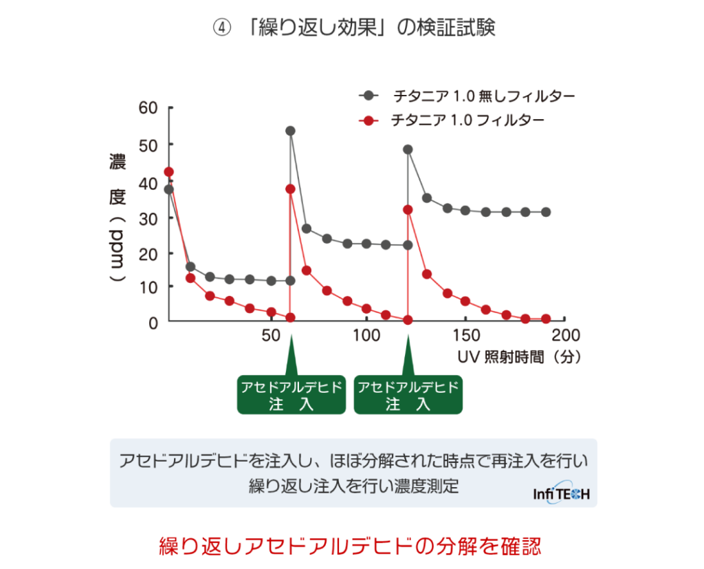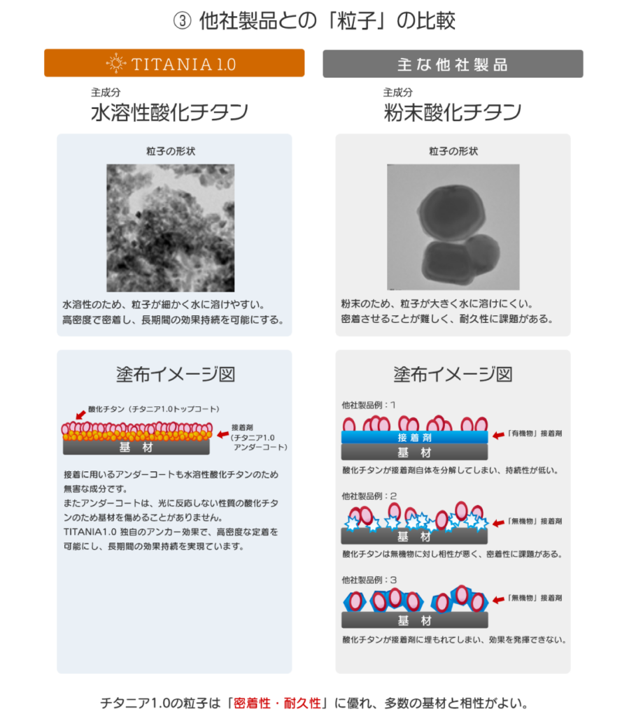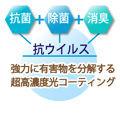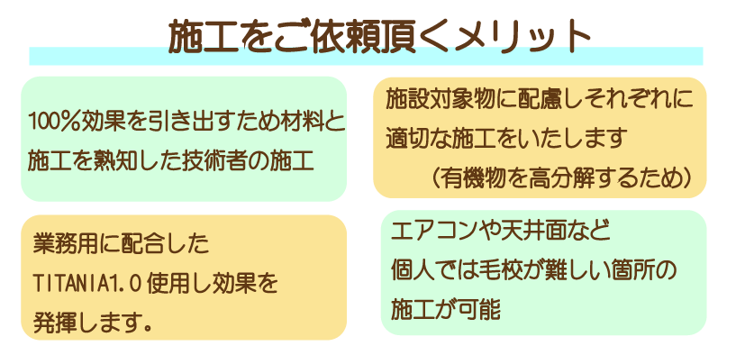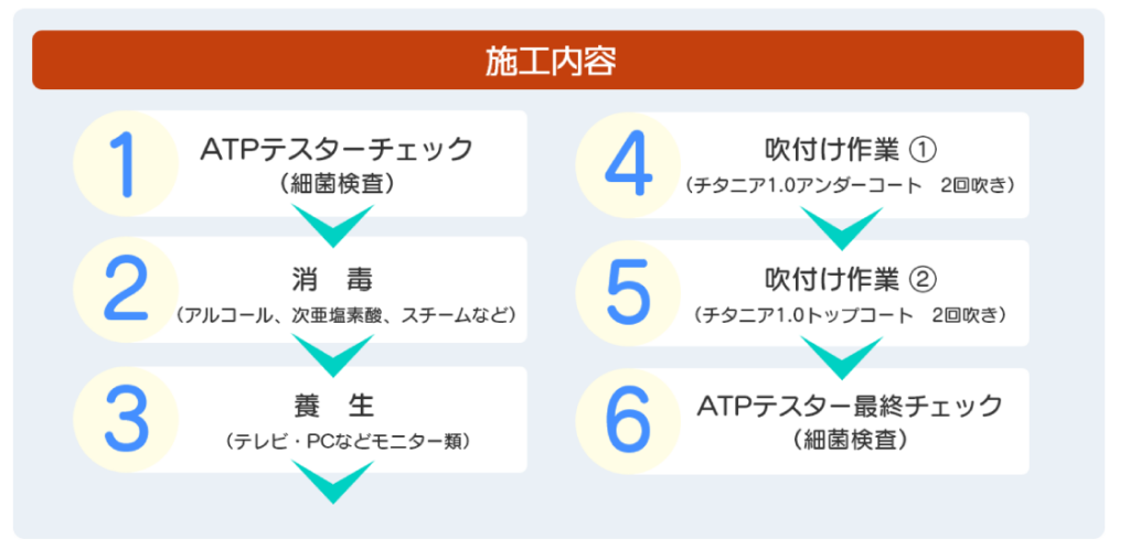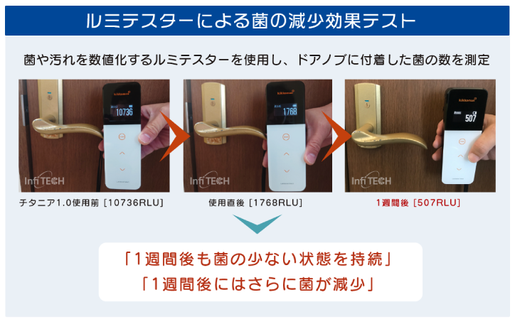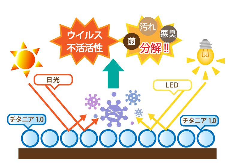 TITANIA1.0の「新型コロナウイルス」への 有効性が確認されました第三者機関の試験において、インフィテック株式会社が開発・製造する光触 媒製品「TITANIA1.0」による「新型コロナウイルス(SARS CoV-2)」の不活化を確認 しました。 日々の消毒・除菌を少しでも楽に、効果的に! 接触感染対策に効果大!チタニア1.0は「抗ウイルス・除菌・抗菌・消臭」などの効果を持つ光触媒製品です。チタニア1.0を吹き付けた面に付着した菌やウイルスは、光が当たることにより「継続して無力化」されます。 この「継続する効果」と「人体に無害な成分」であることが、一般的な消毒「アルコール・漂白剤(次亜塩素酸ナトリウム)」などとの大きな違いです。除菌を行うことが日常となった今、チタニア1.0を使用すれば日々の除菌作業の負担を減らし少しでも楽に、より効果的なウイルス・菌対策が可能です。また継続して除菌する効果は、様々な人が触れるドアノブや水道の蛇口などにとても効果的です。チタニア1.0はインフィテック株式会社が開発・製造する光触媒製品です。 チタニア1.0を吹付けた表面は、様々な有機物を強力に分解し「除菌・抗菌・防カビ・消臭」などの効果を発揮します。太陽光はもちろん、紫外線、蛍光、ED、ブラックライトでも反応し、チタニア1.0が残存する限り常に分解効果を発揮し続けます。チタニア1.0は、「アルコール・次亜塩素酸ナトリウム」などとは違い無害な成分で作られており、人体にも環境にもやさしい製品です。 「 プロによる業務用特殊施工 」 2年間の効果を保証する施工です 専門知識を持った専任の技術者により消毒作業と、より密着性の高い業務用チタニア1.0による2層コーティングを施します。部屋を丸ごとでも、テーブルや椅子のみなど部分的でも、幅広く対応可能です。※ 施工保証書を発行します ムラなく隅々まで、布類などには素材の奥まで、しっかりと効果を引き出す専門の技術者による施工 一般には扱いにくい限界レベルの高濃度。(スプレーボトルタイプの約3倍)より高密度にチタニア1.0の膜を形成し、隙間なく分解効果を発揮します 2層構造のコーティングにより高密知着を実現し、素材を痛めること無く長期間効果を持続させます。 菌や汚れを数値化し、施工後の効果を目に見える形でご確認いただけます 家具1つ1つから、店舗やイベントスペースなどの大型の施設も丸ごと施工可能 専門知識を持った専任の技術者により消毒作業と、より密着性の高い業務用チタニア1.0による2層コーティングを施します。部屋を丸ごとでも、テーブルや椅子のみなど部分的でも、幅広く対応可能です。※ 施工保証書を発行します ※ ガラス・プラスチックなどの無機物には密着しにくい場合があります※ 色の濃い物や撥水性の高い素材への使用は、白く跡が残る場合がありますので必ず適量を守り必要に応じて拭き上げてください